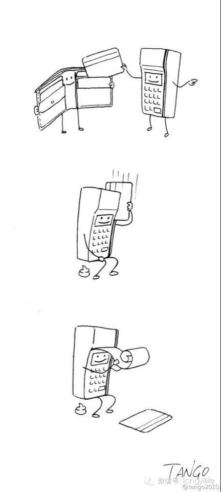“没纸了,借你卡用用~”刷卡机要上厕所